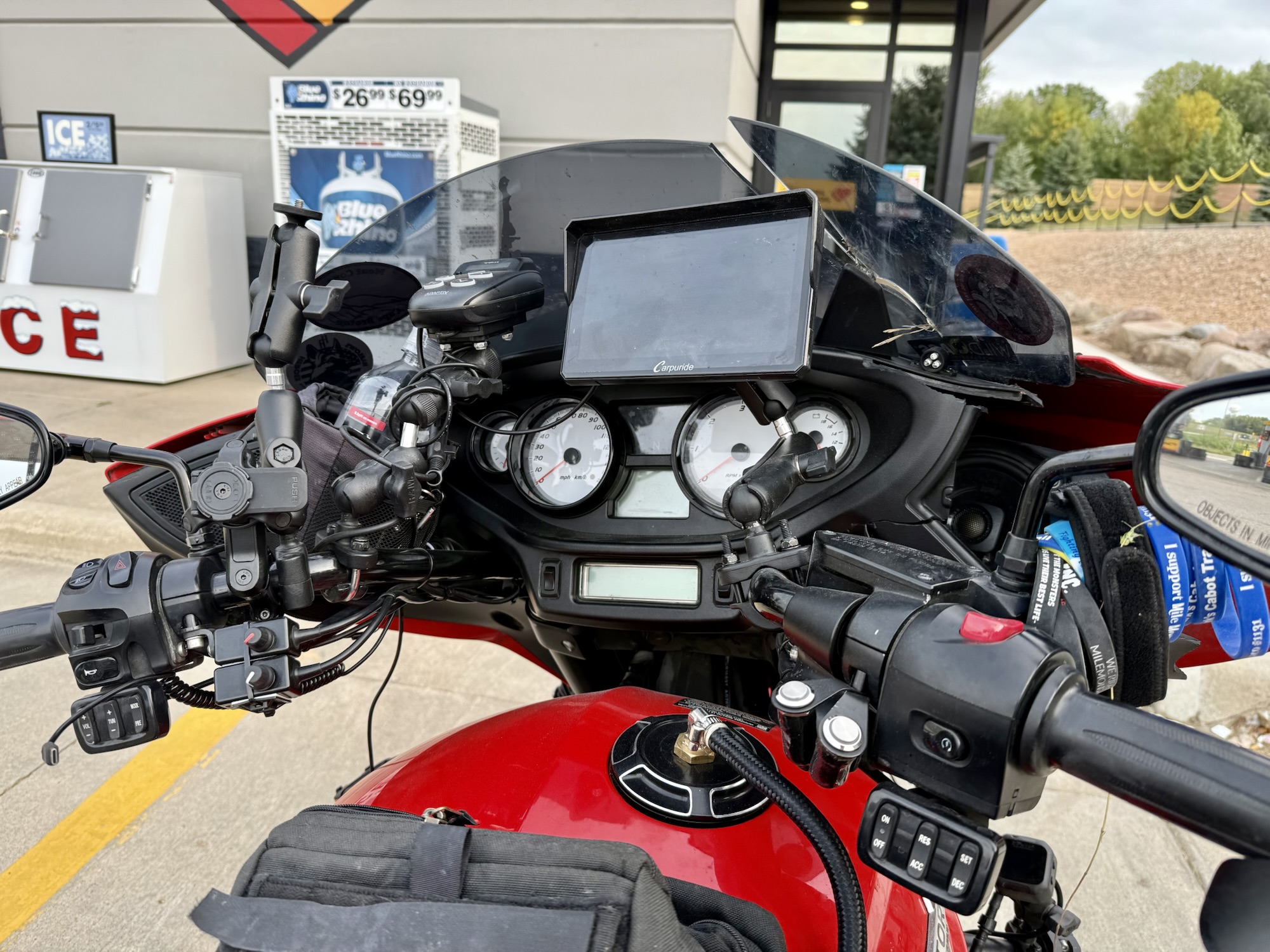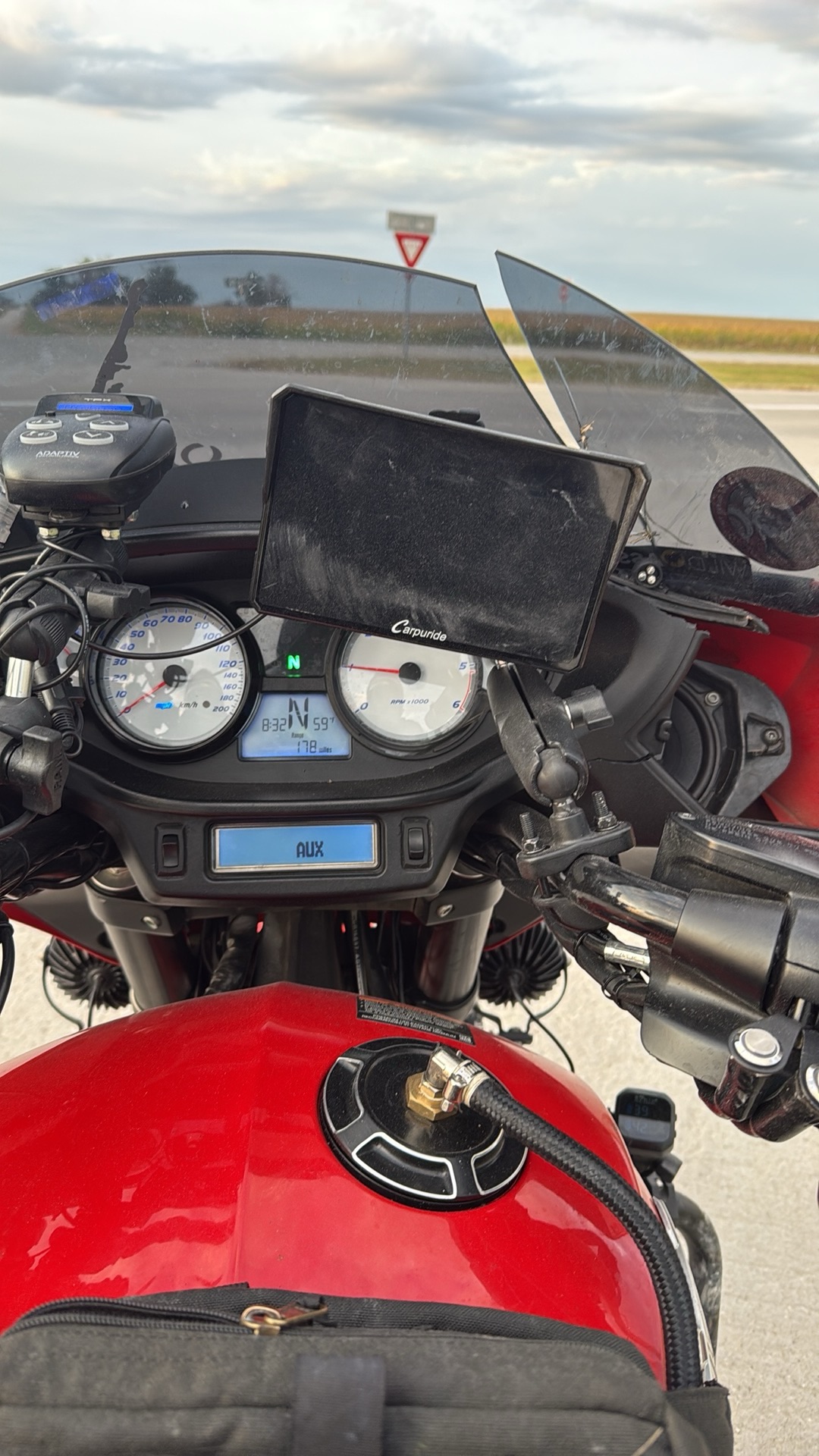 Turns out it was freshly milled, layered with loose, unpacked gravel. The first quarter mile was meh OK — manageable, even kinda fun — until it wasn’t. The gravel got deeper, the front tire started sinking, and before I could react, she sank. I drifted toward the middle of the road, tried to correct, and then… plop — Ole’ Red and I went down.