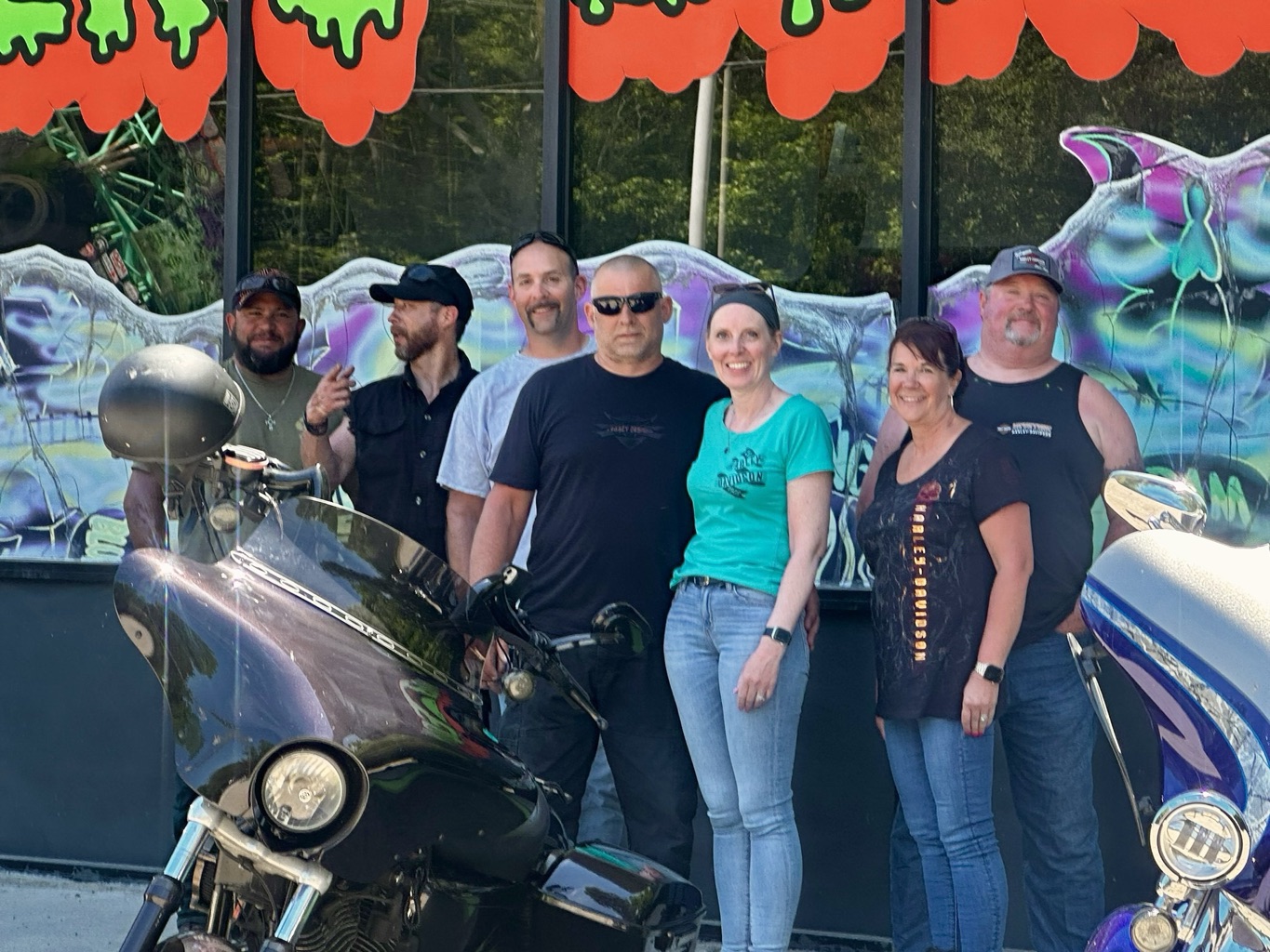 She’s riding this supercharged, wind-cutting, butter-slicing, high-horsepower Sportster built with so much attitude it looks like it could outrun both the weather and the IRS — and yes, we tease her about it constantly.